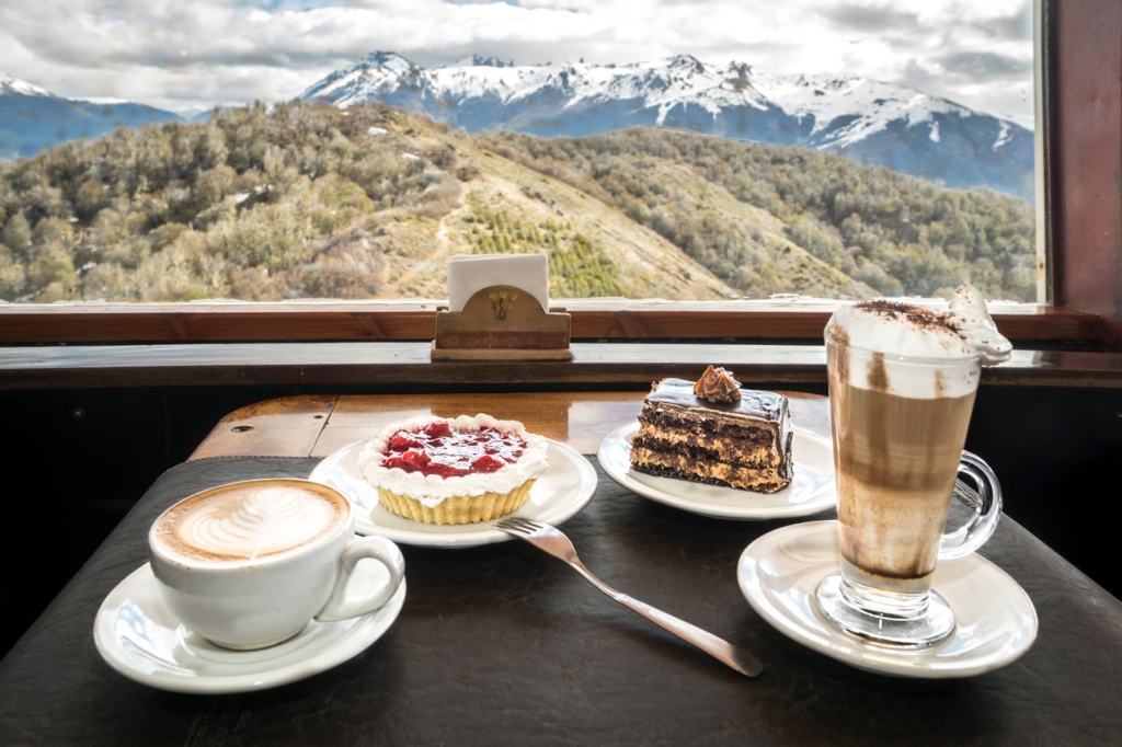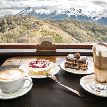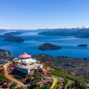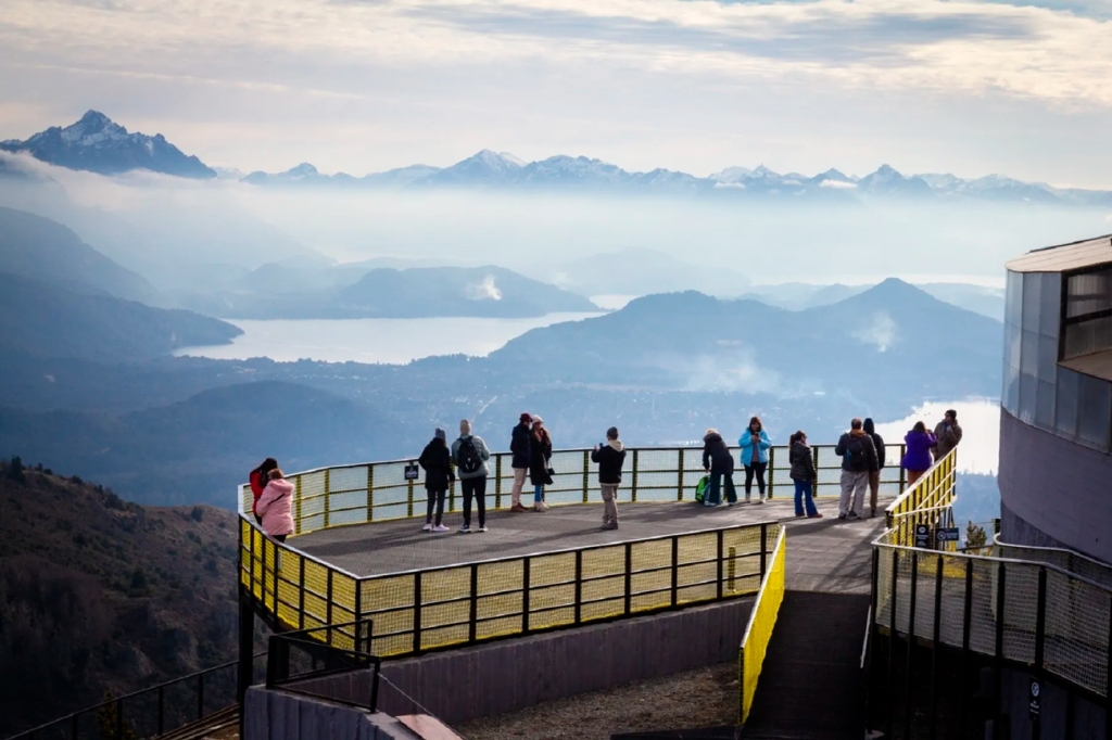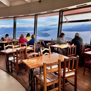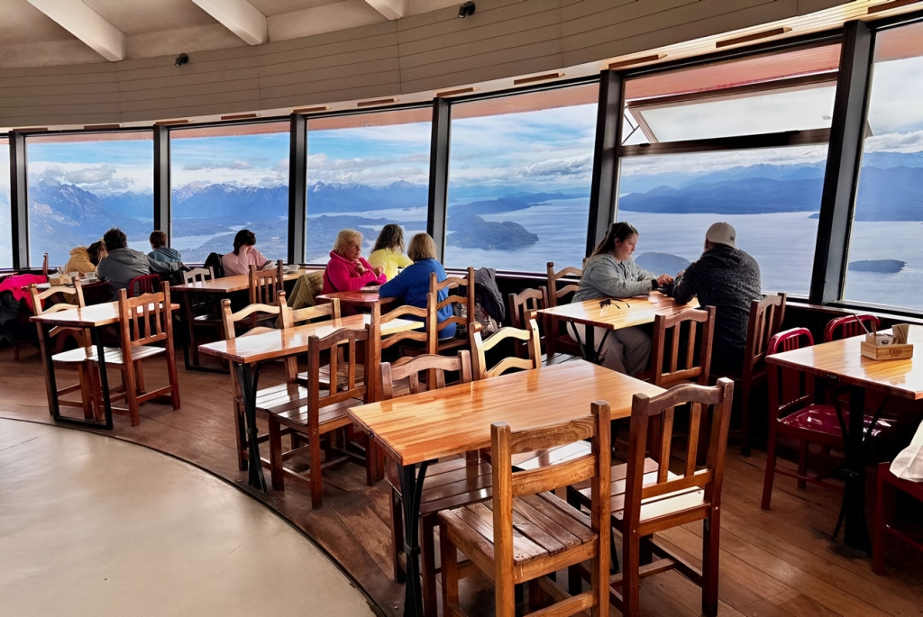 En la cumbre, la icónica Confitería Giratoria brinda una experiencia distintiva: mientras disfrutan de un café o una merienda, la estructura completa gira suavemente 360°, ofreciendo vistas continuas del Cerro Tronador, los Cerros Catedral y López, y del inmenso Lago Nahuel Huapi que caracteriza a Bariloche.